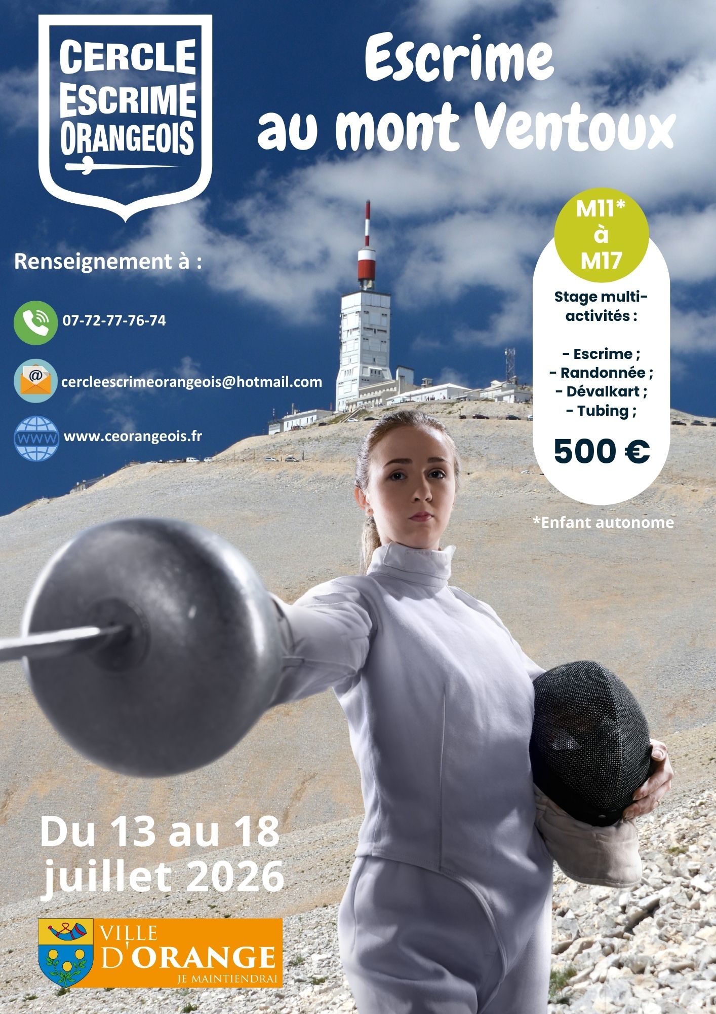 Du 13 au 18 juillet 2026, le Cercle d’Escrime Orangeois vous propose une semaine de stages estivaux inoubliables, alliant sport et aventure pour petits et grands ! Situé dans un cadre naturel exceptionnel, ce séjour multi-activités promet de faire le plein de sensations avec un programme varié : initiation à l’escrime, randonnées à travers des paysages magnifiques, dévalkart et tubing pour des descentes à couper le souffle. Chaque journée est pensée pour offrir une expérience ludique, sportive et conviviale. Que vous soyez débutant ou passionné, venez profiter d’une ambiance chaleureuse et dynamique, le tout encadré par des professionnels qualifiés.